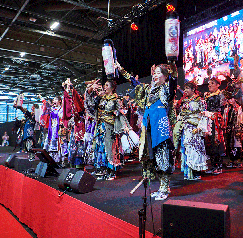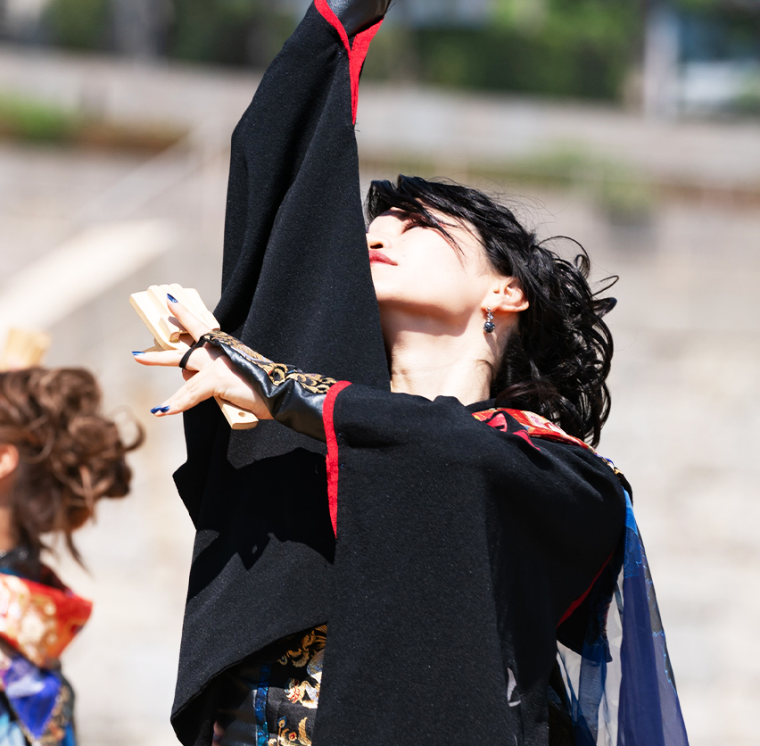 和楽器と現代音楽を融合させたオリジナル楽曲。耳に残る旋律と迫力のリズムで、踊りをよりドラマティックに彩ります。